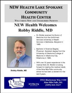 NEW Health Lake Spokane Community Health Center is excited to announce the addition of Dr. Robby Riddle to our Family Practice. Dr. Riddle, received his Doctor of Medicine from the Uniformed Services University of Health Services in Bethesda, Maryland in 1995. He received his Bachelors of Science Degree, Physician Assistant degree from the University of Oklahoma College…